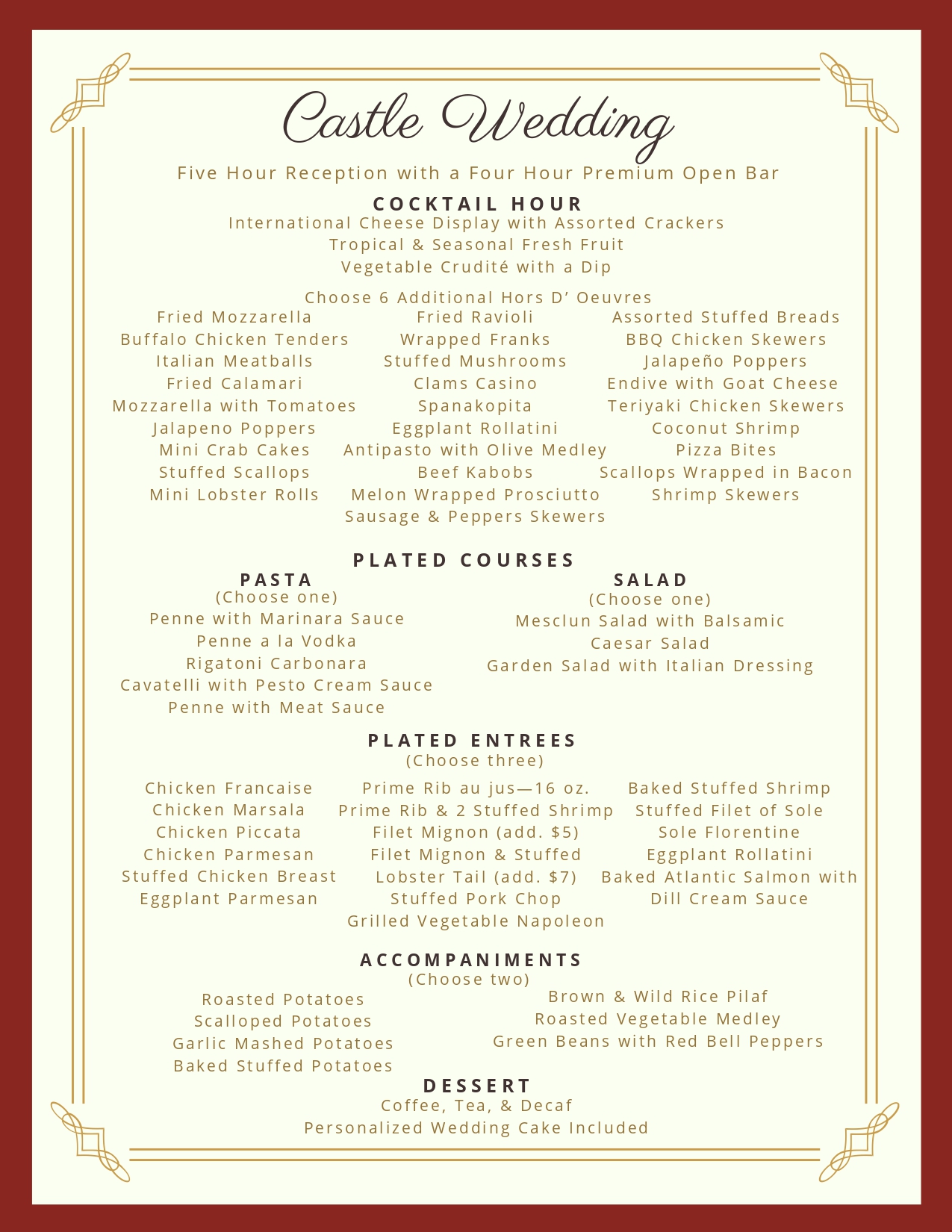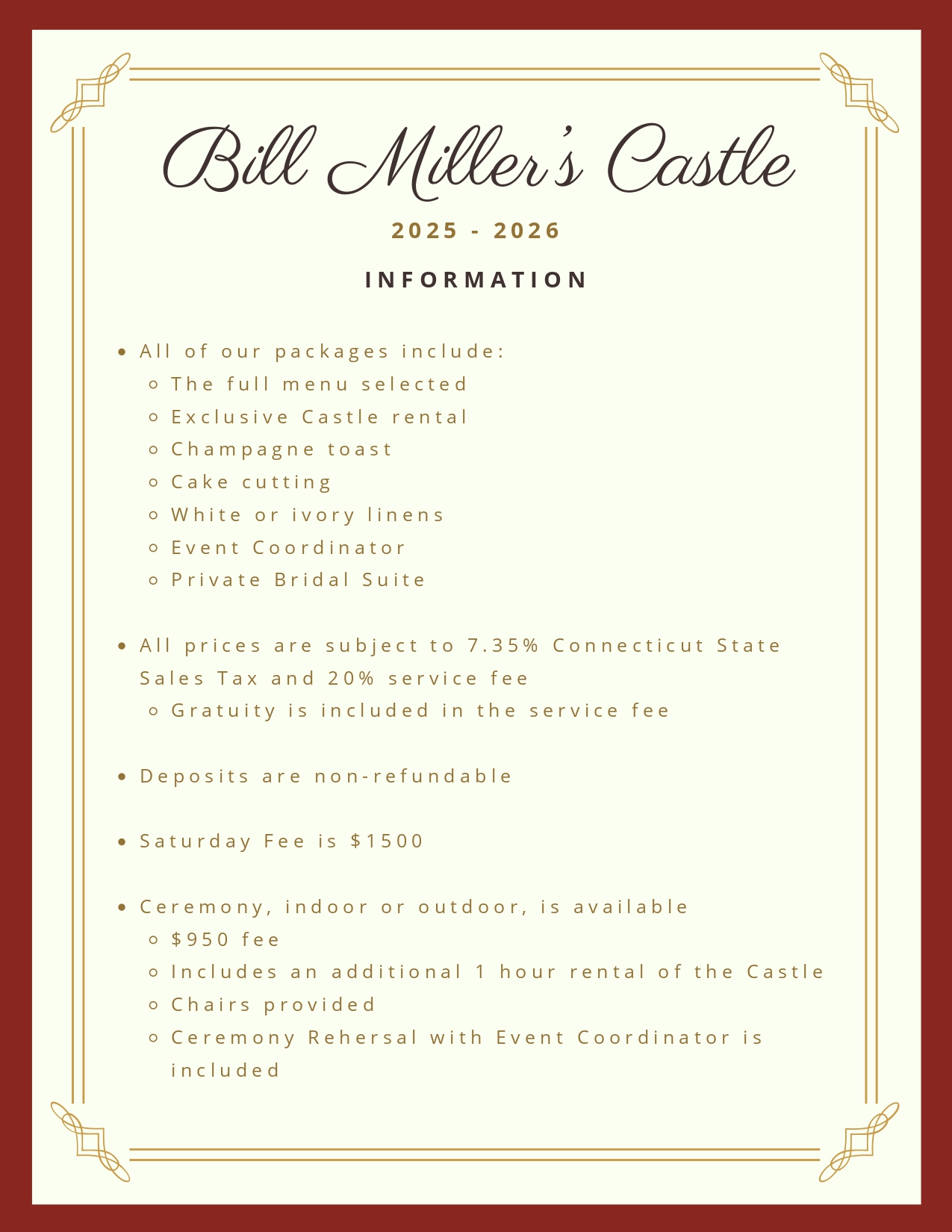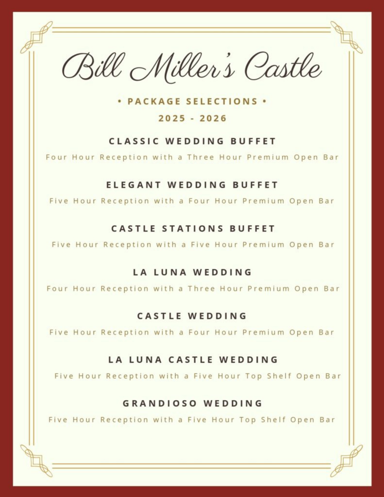 At Bill Miller’s Castle, we understand that every couple is unique. Our wedding packages are fully customizable to ensure your day is everything you imagined and more. We offer: